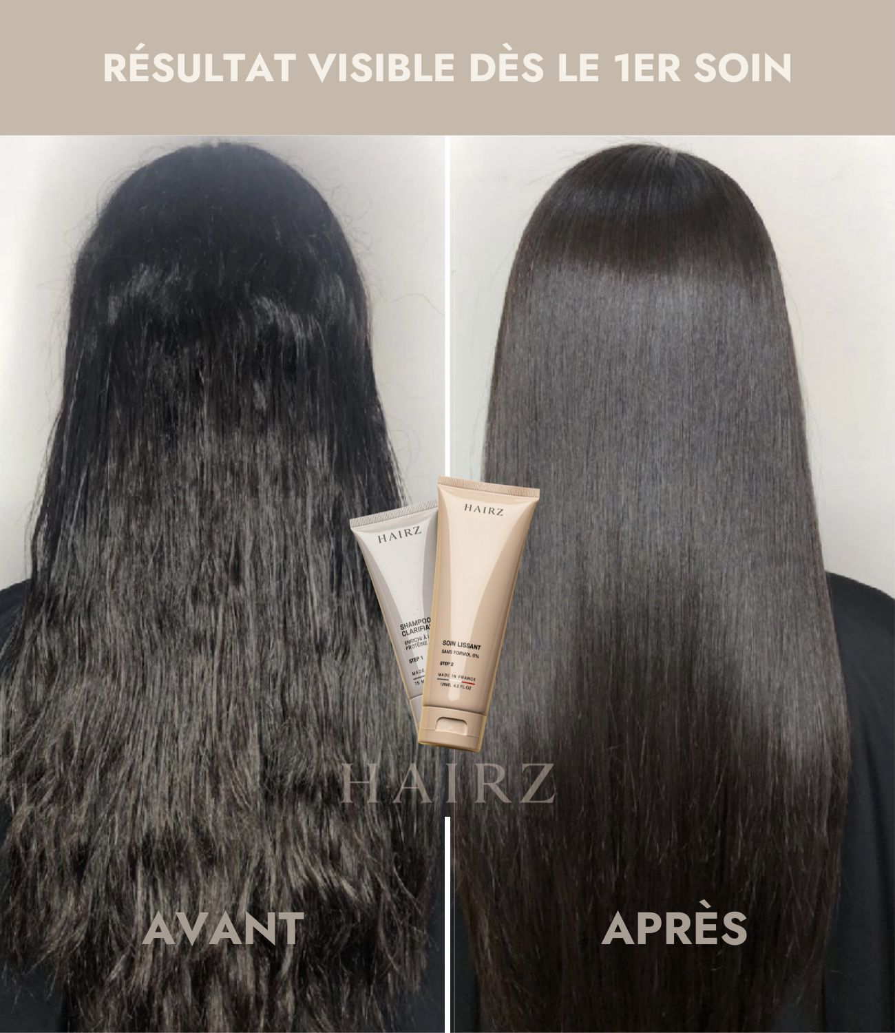 Non. Le kit Hairz est formulé sans formol et pensé pour discipliner la fibre capillaire sans l’agresser. Le protocole agit en douceur, tout en préservant la souplesse et l’intégrité du cheveu.